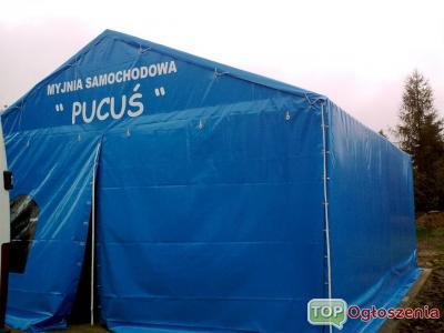 Oferujemy hale namiotowe na konstrukcji stalowej ocynkowanej o rozpiętości od 10 do 30 m, długości nieograniczonej, ramy co 5 m, oferujemy hale w obudowie w całości w materiale PCV niemieckich producentów o gramaturze od 650 do 700 g lub w obudowie, dach z materiału PCV, ściany blacha trapez Pruszyński.