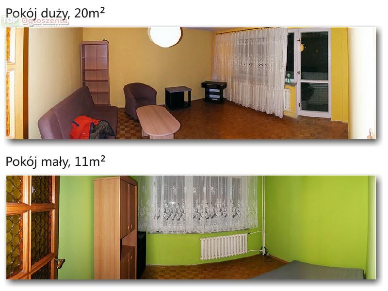dwa rozkładowe pokoje (20m i 11m) przedzielone dużą widną kuchnią,